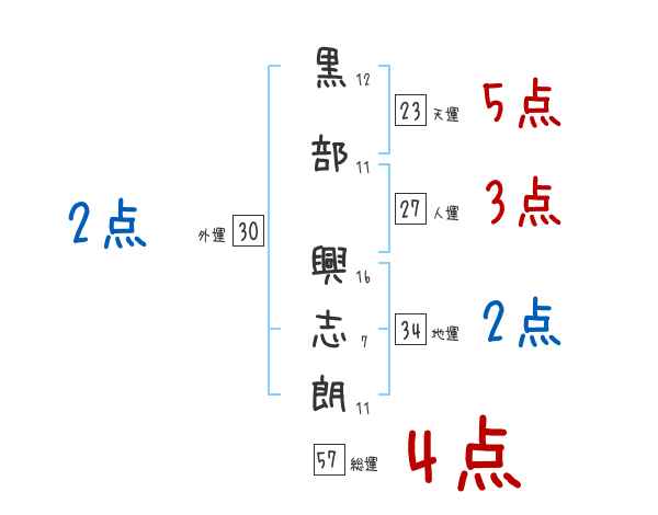 総運![]() | 黒部興志朗さんの総運は57画の4つ星!向上心があり人望がある。地位を得る。 あなたの人生を表す1番重要な運勢です。生涯を通じて影響する総合運となり、主に50歳以降の晩年期に影響を及ぼします。 |