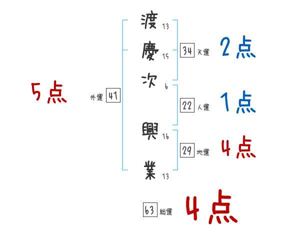 外運![]() | 渡慶次興業さんの外運は41画の5つ星!大志を抱き、目標に向かって実力を発揮し達成する。温和な性格。 生活面を象徴する運勢です。外部から受ける影響力を表し、結婚運、家庭運や職場、環境への順応性を表します。 |