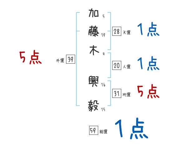 外運![]() | 加藤木興毅さんの外運は39画の5つ星!社交性に優れ人望が厚い。人の上に立ち成功する。 生活面を象徴する運勢です。外部から受ける影響力を表し、結婚運、家庭運や職場、環境への順応性を表します。 |