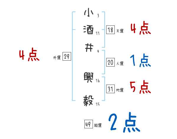 外運![]() | 小酒井興毅さんの外運は29画の4つ星!完全主義で才能がある。厳格な心の持ち主。 生活面を象徴する運勢です。外部から受ける影響力を表し、結婚運、家庭運や職場、環境への順応性を表します。 |