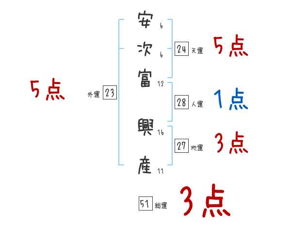 総運![]() | 安次富興産さんの総運は51画の3つ星!変化が激しく、危険に注意。堅実な性格。 あなたの人生を表す1番重要な運勢です。生涯を通じて影響する総合運となり、主に50歳以降の晩年期に影響を及ぼします。 |