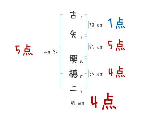 外運![]() | 古矢興穂二さんの外運は24画の5つ星!家庭運が良く順調な人生。金運にも恵まれる。 生活面を象徴する運勢です。外部から受ける影響力を表し、結婚運、家庭運や職場、環境への順応性を表します。 |