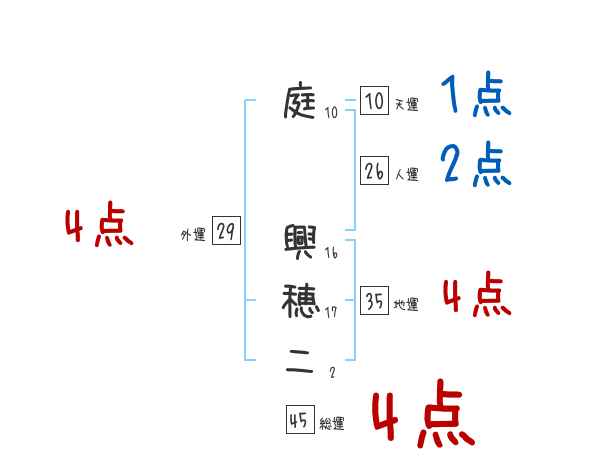 外運![]() | 庭興穂二さんの外運は29画の4つ星!完全主義で才能がある。厳格な心の持ち主。 生活面を象徴する運勢です。外部から受ける影響力を表し、結婚運、家庭運や職場、環境への順応性を表します。 |