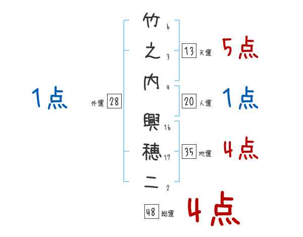 外運![]() | 竹之内興穂二さんの外運は28画の1つ星!家庭環境に注意。スポーツで活躍できる能力があるかも。 生活面を象徴する運勢です。外部から受ける影響力を表し、結婚運、家庭運や職場、環境への順応性を表します。 |