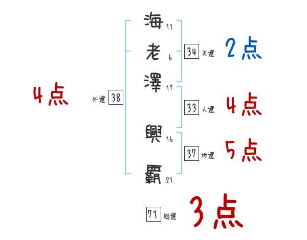 人運![]() | 海老澤興覇さんの人運は33画の4つ星!権力志向でプライドが高い。勇気があり運を切り開き成功する。 性格や才能などを表す2番目に重要な運勢です。人間関係や協調性、社会的な成功に影響します。主に20歳から50歳ぐらいまでの中年期の運勢を表します。 |