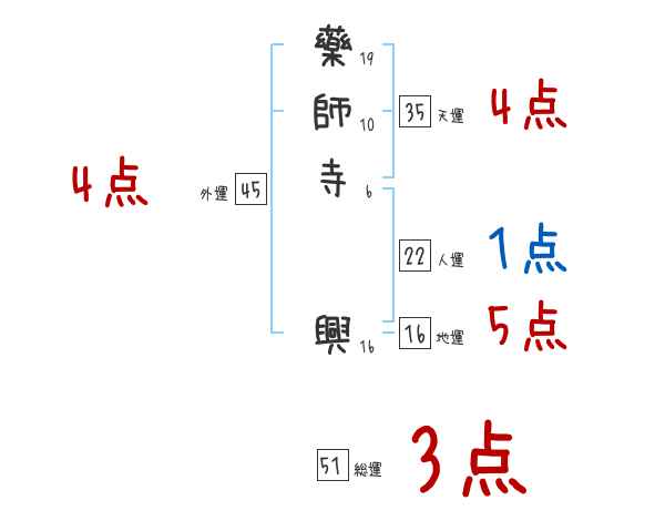 地運![]() | 藥師寺興さんの地運は16画の5つ星!人望が厚く大きく発展する。逆転成功が見える。 個性を表す基礎的な運勢です。性格形成や対人関係、行動力など家庭環境に影響されます。主に誕生してから20歳くらいまでの若年期の運勢を表します。 |