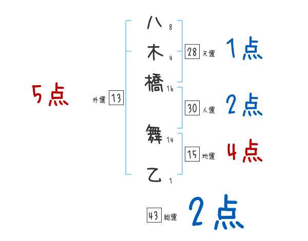総運![]() | 八木橋舞乙さんの総運は43画の2つ星!頑固な性格で独立心が強いかも。やや非現実的で浪費に注意しましょう。 あなたの人生を表す1番重要な運勢です。生涯を通じて影響する総合運となり、主に50歳以降の晩年期に影響を及ぼします。 |