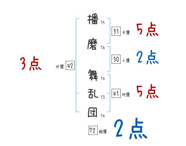 天運![]() | 播磨舞乱団さんの天運は31画の5つ星!社交性があり判断力に優れる。順風満帆な人生で円満な生活。 家系が持つ宿命的な運勢を表します。祖先から受け継いだ苗字ですので自分の力が及びません。家柄を象徴します。 |