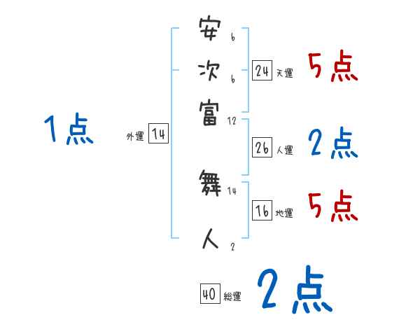 天運![]() | 安次富舞人さんの天運は24画の5つ星!家庭運が良く順調な人生。金運にも恵まれる。 家系が持つ宿命的な運勢を表します。祖先から受け継いだ苗字ですので自分の力が及びません。家柄を象徴します。 |