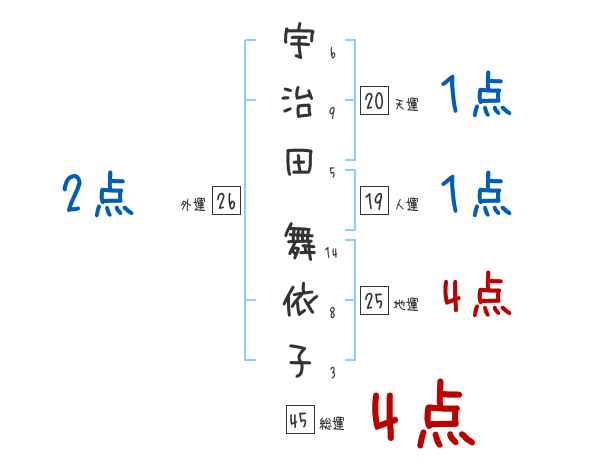 外運![]() | 宇治田舞依子さんの外運は26画の2つ星!波瀾万丈かも。信頼できる人を大事にしましょう。 生活面を象徴する運勢です。外部から受ける影響力を表し、結婚運、家庭運や職場、環境への順応性を表します。 |