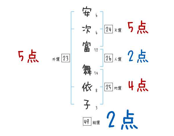 外運![]() | 安次富舞依子さんの外運は23画の5つ星!想像力に優れ活力がある。一代で成功し名誉を手に入れる。 生活面を象徴する運勢です。外部から受ける影響力を表し、結婚運、家庭運や職場、環境への順応性を表します。 |