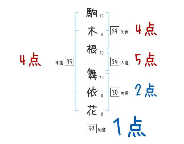 外運![]() | 駒木根舞依花さんの外運は35画の4つ星!温厚な性格で感受性が高い。穏和な性格で人望が厚い。 生活面を象徴する運勢です。外部から受ける影響力を表し、結婚運、家庭運や職場、環境への順応性を表します。 |