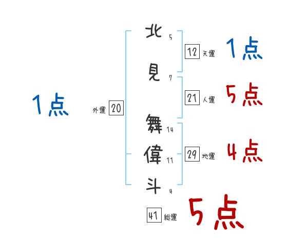 人運![]() | 北見舞偉斗さんの人運は21画の5つ星!統率力がある。独立し成功する。名誉を手に入れる。 性格や才能などを表す2番目に重要な運勢です。人間関係や協調性、社会的な成功に影響します。主に20歳から50歳ぐらいまでの中年期の運勢を表します。 |