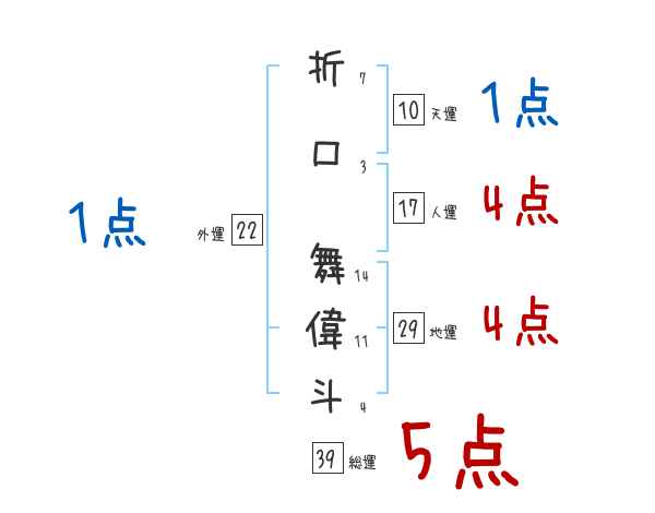 天運![]() | 折口舞偉斗さんの天運は10画の1つ星!不安を感じやすい傾向。ストレスを抱えないように注意しましょう。 家系が持つ宿命的な運勢を表します。祖先から受け継いだ苗字ですので自分の力が及びません。家柄を象徴します。 |