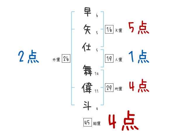 外運![]() | 早矢仕舞偉斗さんの外運は26画の2つ星!波瀾万丈かも。信頼できる人を大事にしましょう。 生活面を象徴する運勢です。外部から受ける影響力を表し、結婚運、家庭運や職場、環境への順応性を表します。 |