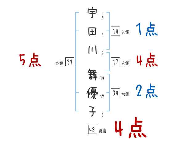 天運![]() | 宇田川舞優子さんの天運は14画の1つ星!人に対して優しいがストレスを溜め込みがち。人間関係のトラブルを避けるよう気をつけましょう。 家系が持つ宿命的な運勢を表します。祖先から受け継いだ苗字ですので自分の力が及びません。家柄を象徴します。 |