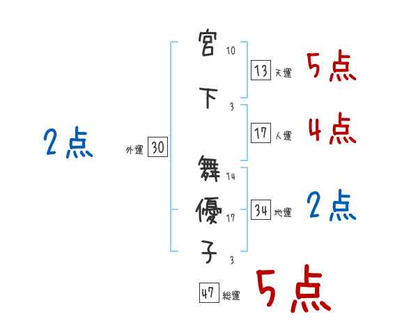 総運![]() | 宮下舞優子さんの総運は47画の5つ星!実力が開花し発展する円満な人生。財に恵まれる。 あなたの人生を表す1番重要な運勢です。生涯を通じて影響する総合運となり、主に50歳以降の晩年期に影響を及ぼします。 |