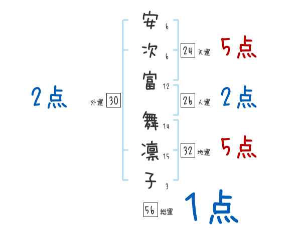 総運![]() | 安次富舞凛子さんの総運は56画の1つ星!消極的で無気力になりがち。誠実な気持ちが必要でしょう。 あなたの人生を表す1番重要な運勢です。生涯を通じて影響する総合運となり、主に50歳以降の晩年期に影響を及ぼします。 |