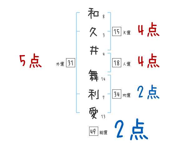 外運![]() | 和久井舞利愛さんの外運は31画の5つ星!社交性があり判断力に優れる。順風満帆な人生で円満な生活。 生活面を象徴する運勢です。外部から受ける影響力を表し、結婚運、家庭運や職場、環境への順応性を表します。 |