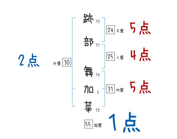 外運![]() | 跡部舞加菜さんの外運は30画の2つ星!浮き沈みの激しさに注意しましょう。 生活面を象徴する運勢です。外部から受ける影響力を表し、結婚運、家庭運や職場、環境への順応性を表します。 |