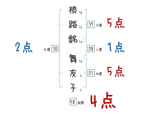 総運![]() | 根路銘舞友子さんの総運は58画の4つ星!安定した生活。大器晩成タイプ。 あなたの人生を表す1番重要な運勢です。生涯を通じて影響する総合運となり、主に50歳以降の晩年期に影響を及ぼします。 |