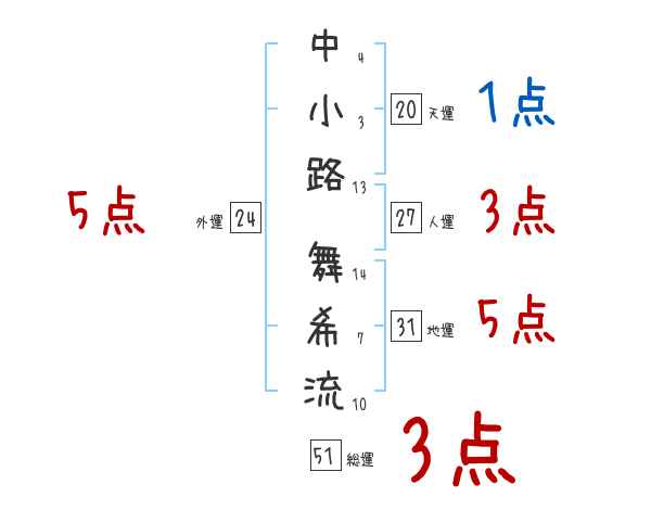 外運![]() | 中小路舞希流さんの外運は24画の5つ星!家庭運が良く順調な人生。金運にも恵まれる。 生活面を象徴する運勢です。外部から受ける影響力を表し、結婚運、家庭運や職場、環境への順応性を表します。 |