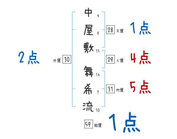 外運![]() | 中屋敷舞希流さんの外運は30画の2つ星!浮き沈みの激しさに注意しましょう。 生活面を象徴する運勢です。外部から受ける影響力を表し、結婚運、家庭運や職場、環境への順応性を表します。 |