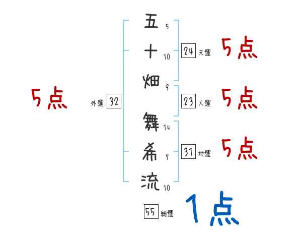 外運![]() | 五十畑舞希流さんの外運は32画の5つ星!柔軟性があり成功する。チャンスが多く金運が良い。 生活面を象徴する運勢です。外部から受ける影響力を表し、結婚運、家庭運や職場、環境への順応性を表します。 |