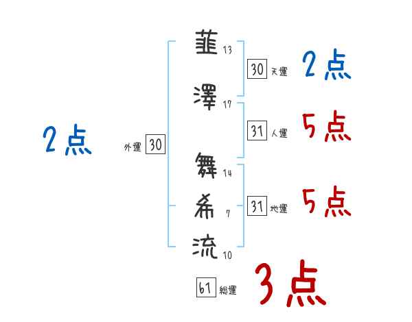 天運![]() | 韮澤舞希流さんの天運は30画の2つ星!浮き沈みの激しさに注意しましょう。 家系が持つ宿命的な運勢を表します。祖先から受け継いだ苗字ですので自分の力が及びません。家柄を象徴します。 |