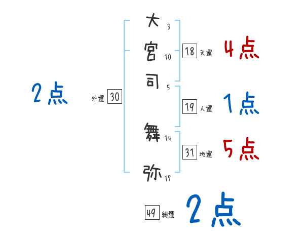 天運![]() | 大宮司舞弥さんの天運は18画の4つ星!情熱的で剛気。忍耐力があり信頼される。 家系が持つ宿命的な運勢を表します。祖先から受け継いだ苗字ですので自分の力が及びません。家柄を象徴します。 |