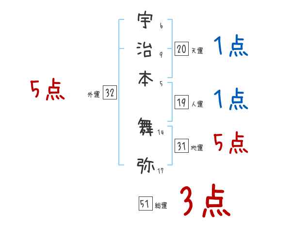 外運![]() | 宇治本舞弥さんの外運は32画の5つ星!柔軟性があり成功する。チャンスが多く金運が良い。 生活面を象徴する運勢です。外部から受ける影響力を表し、結婚運、家庭運や職場、環境への順応性を表します。 |