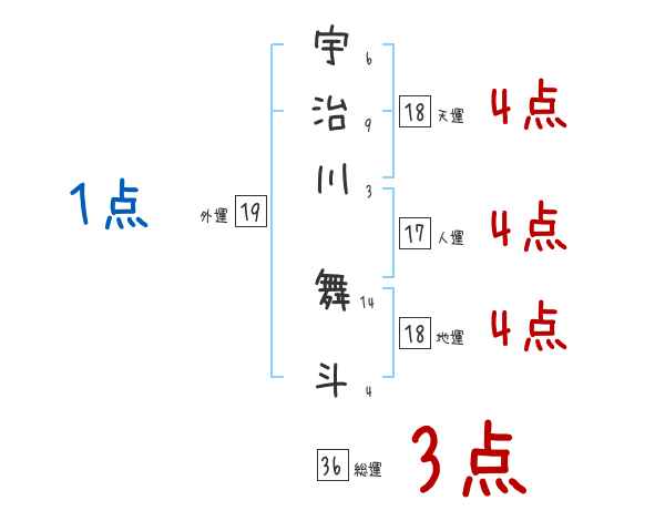 総運![]() | 宇治川舞斗さんの総運は36画の3つ星!先見性が豊かです。多少神経質で苦労することも。 あなたの人生を表す1番重要な運勢です。生涯を通じて影響する総合運となり、主に50歳以降の晩年期に影響を及ぼします。 |