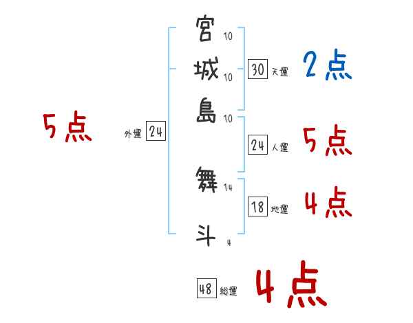 外運![]() | 宮城島舞斗さんの外運は24画の5つ星!家庭運が良く順調な人生。金運にも恵まれる。 生活面を象徴する運勢です。外部から受ける影響力を表し、結婚運、家庭運や職場、環境への順応性を表します。 |