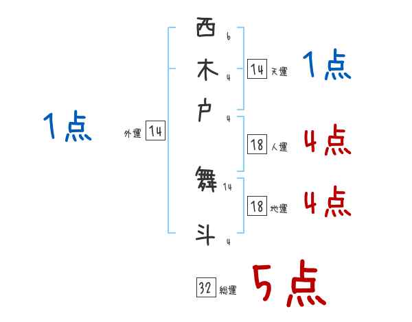 総運![]() | 西木戸舞斗さんの総運は32画の5つ星!柔軟性があり成功する。チャンスが多く金運が良い。 あなたの人生を表す1番重要な運勢です。生涯を通じて影響する総合運となり、主に50歳以降の晩年期に影響を及ぼします。 |