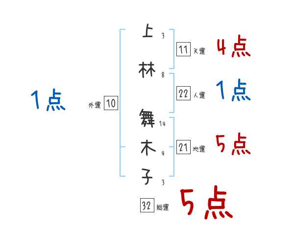 総運![]() | 上林舞木子さんの総運は32画の5つ星!柔軟性があり成功する。チャンスが多く金運が良い。 あなたの人生を表す1番重要な運勢です。生涯を通じて影響する総合運となり、主に50歳以降の晩年期に影響を及ぼします。 |