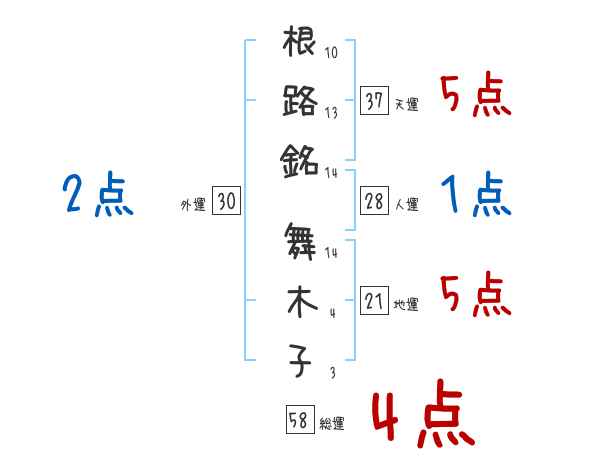 総運![]() | 根路銘舞木子さんの総運は58画の4つ星!安定した生活。大器晩成タイプ。 あなたの人生を表す1番重要な運勢です。生涯を通じて影響する総合運となり、主に50歳以降の晩年期に影響を及ぼします。 |