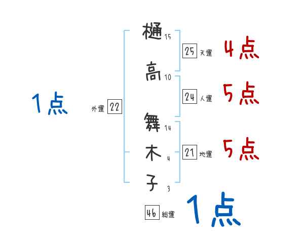 総運![]() | 樋高舞木子さんの総運は46画の1つ星!迷走することが多く苦労するかも。目先のことにとらわれないように。 あなたの人生を表す1番重要な運勢です。生涯を通じて影響する総合運となり、主に50歳以降の晩年期に影響を及ぼします。 |