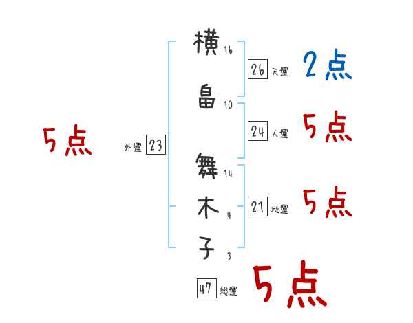 総運![]() | 横畠舞木子さんの総運は47画の5つ星!実力が開花し発展する円満な人生。財に恵まれる。 あなたの人生を表す1番重要な運勢です。生涯を通じて影響する総合運となり、主に50歳以降の晩年期に影響を及ぼします。 |
