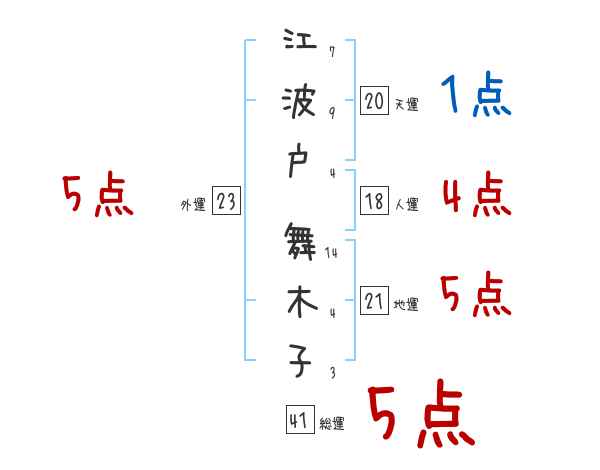 外運![]() | 江波戸舞木子さんの外運は23画の5つ星!想像力に優れ活力がある。一代で成功し名誉を手に入れる。 生活面を象徴する運勢です。外部から受ける影響力を表し、結婚運、家庭運や職場、環境への順応性を表します。 |