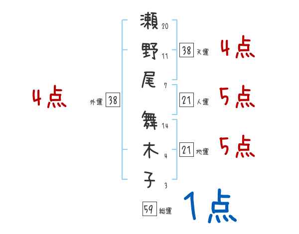 総運![]() | 瀬野尾舞木子さんの総運は59画の1つ星!意志の弱さであきらめることが多いかも。粘り強さが必要。 あなたの人生を表す1番重要な運勢です。生涯を通じて影響する総合運となり、主に50歳以降の晩年期に影響を及ぼします。 |