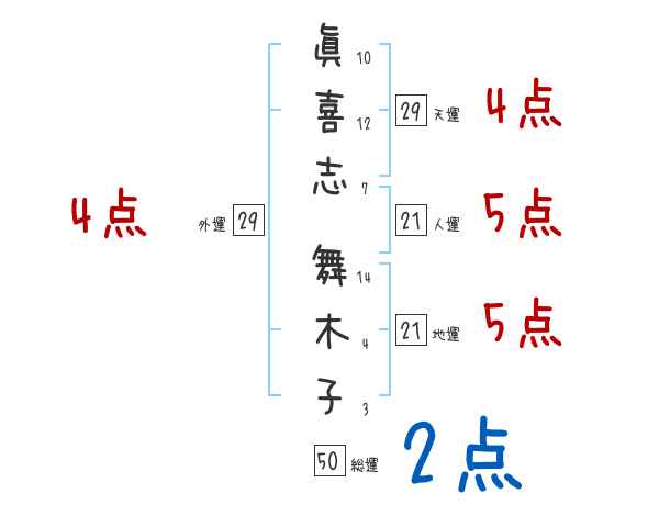 天運![]() | 眞喜志舞木子さんの天運は29画の4つ星!完全主義で才能がある。厳格な心の持ち主。 家系が持つ宿命的な運勢を表します。祖先から受け継いだ苗字ですので自分の力が及びません。家柄を象徴します。 |