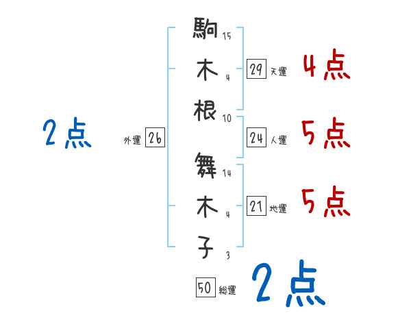 天運![]() | 駒木根舞木子さんの天運は29画の4つ星!完全主義で才能がある。厳格な心の持ち主。 家系が持つ宿命的な運勢を表します。祖先から受け継いだ苗字ですので自分の力が及びません。家柄を象徴します。 |