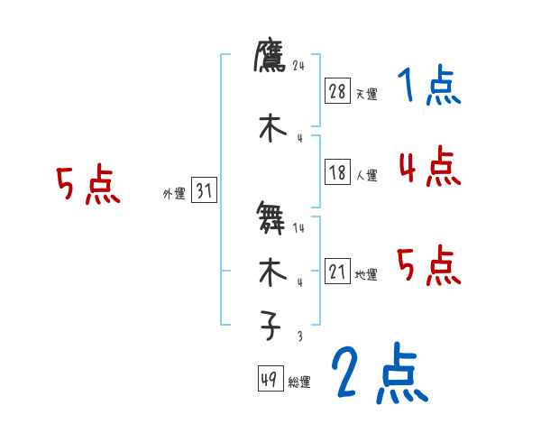 天運![]() | 鷹木舞木子さんの天運は28画の1つ星!家庭環境に注意。スポーツで活躍できる能力があるかも。 家系が持つ宿命的な運勢を表します。祖先から受け継いだ苗字ですので自分の力が及びません。家柄を象徴します。 |