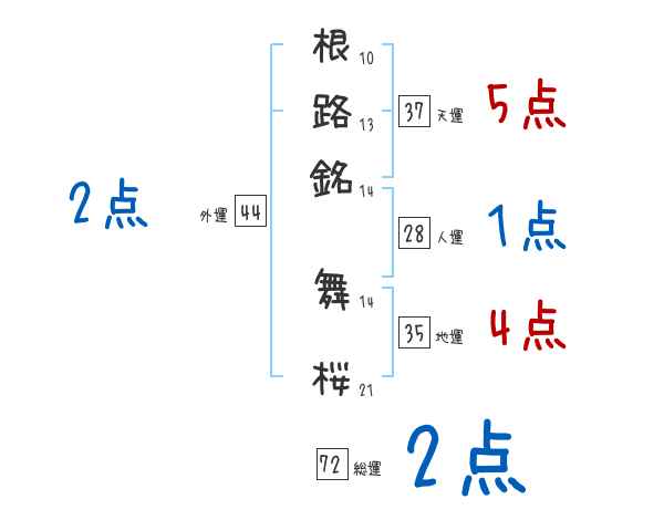 総運![]() | 根路銘舞桜さんの総運は72画の2つ星!災難が多く不安定な生活にならないように注意。明暗のある人生かも。 あなたの人生を表す1番重要な運勢です。生涯を通じて影響する総合運となり、主に50歳以降の晩年期に影響を及ぼします。 |