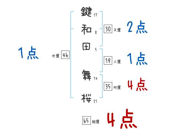 天運![]() | 鍵和田舞桜さんの天運は30画の2つ星!浮き沈みの激しさに注意しましょう。 家系が持つ宿命的な運勢を表します。祖先から受け継いだ苗字ですので自分の力が及びません。家柄を象徴します。 |