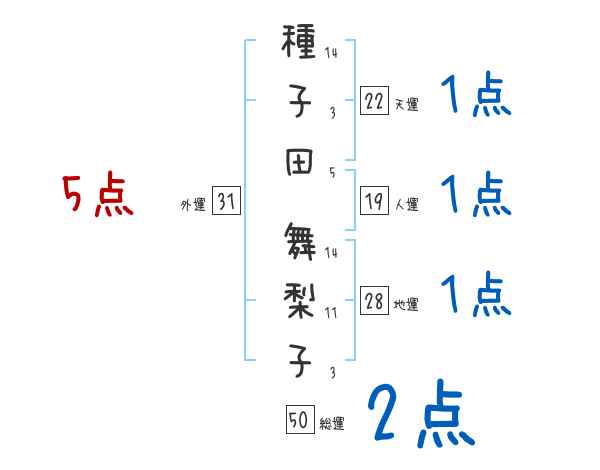 総運![]() | 種子田舞梨子さんの総運は50画の2つ星!浮き沈みが激しく不安定。しりすぼみに衰退しやすいので注意しましょう。 あなたの人生を表す1番重要な運勢です。生涯を通じて影響する総合運となり、主に50歳以降の晩年期に影響を及ぼします。 |