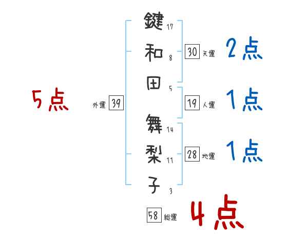 外運![]() | 鍵和田舞梨子さんの外運は39画の5つ星!社交性に優れ人望が厚い。人の上に立ち成功する。 生活面を象徴する運勢です。外部から受ける影響力を表し、結婚運、家庭運や職場、環境への順応性を表します。 |