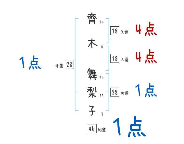天運![]() | 齊木舞梨子さんの天運は18画の4つ星!情熱的で剛気。忍耐力があり信頼される。 家系が持つ宿命的な運勢を表します。祖先から受け継いだ苗字ですので自分の力が及びません。家柄を象徴します。 |