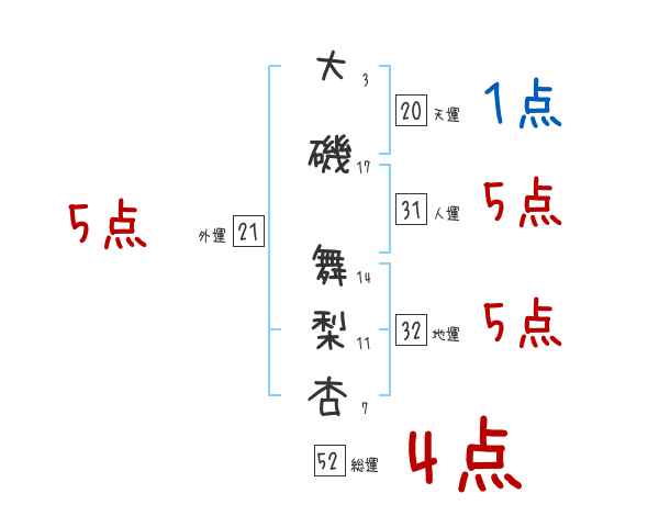 外運![]() | 大磯舞梨杏さんの外運は21画の5つ星!統率力がある。独立し成功する。名誉を手に入れる。 生活面を象徴する運勢です。外部から受ける影響力を表し、結婚運、家庭運や職場、環境への順応性を表します。 |
