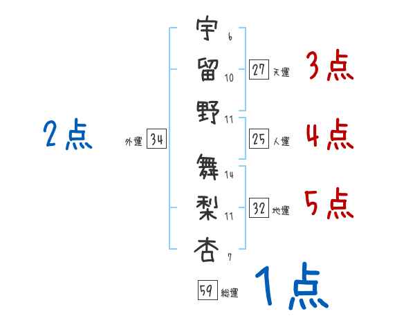 地運![]() | 宇留野舞梨杏さんの地運は32画の5つ星!柔軟性があり成功する。チャンスが多く金運が良い。 個性を表す基礎的な運勢です。性格形成や対人関係、行動力など家庭環境に影響されます。主に誕生してから20歳くらいまでの若年期の運勢を表します。 |